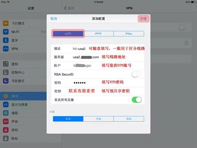 4.选择L2TP方式,填写必要信息:描述、VPN服务器地址 、您注册充值的VPN账号及密码,填写完之后,请点击“存储”: